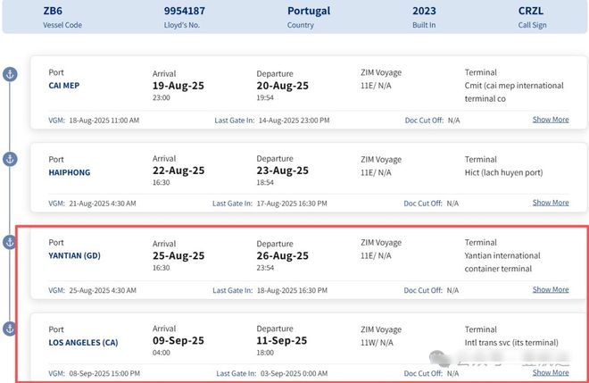 其中,深圳盐田港离港时间为8月26日,预计到达洛杉矶港的到港时间为9月9日。